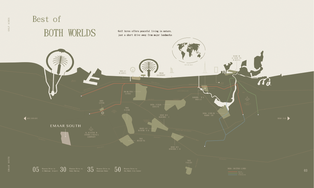 在地理位置上,Golf Acres 交通極為便捷:僅需 5 分鐘可達阿勒馬克圖姆國際機場,15 分鐘可至世博園區,20 分鐘抵達杜拜投資園區,35 分鐘連通杜拜市中心,對於跨城通勤與國際旅行者而言皆極具吸引力。